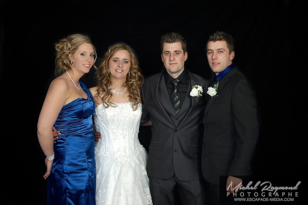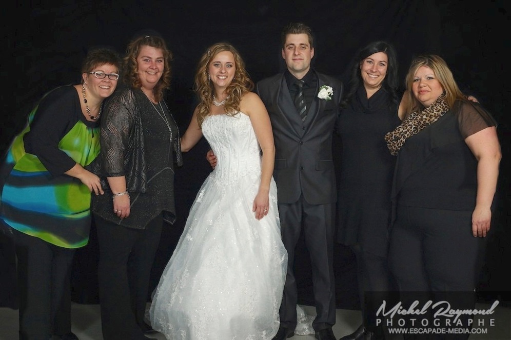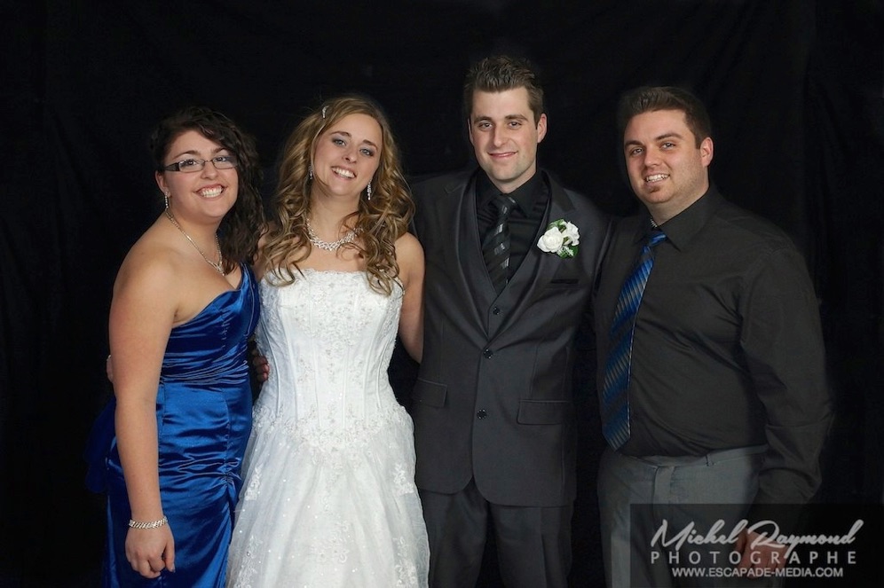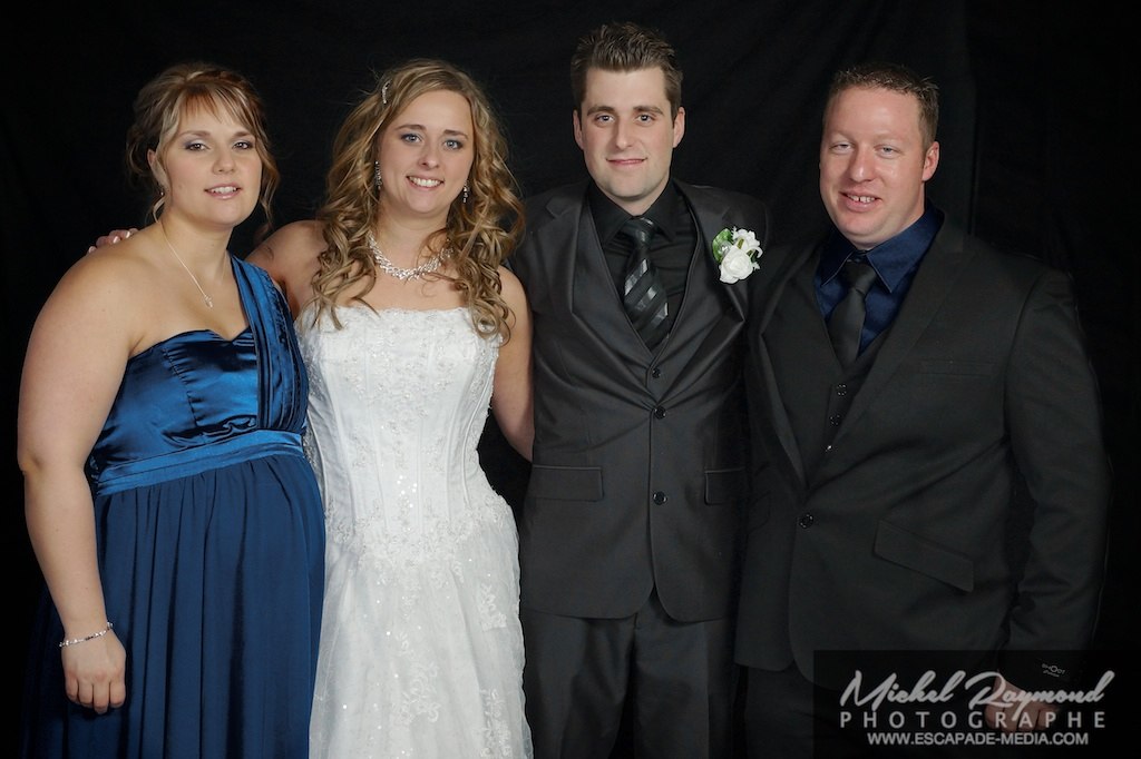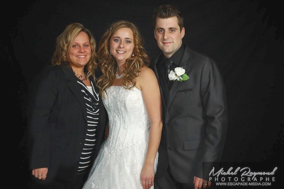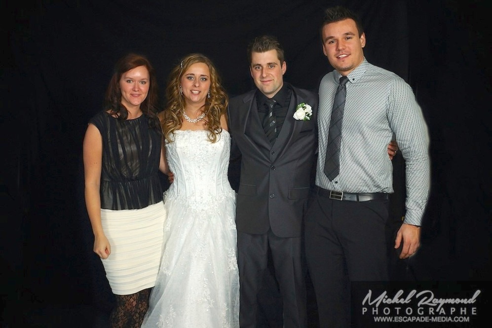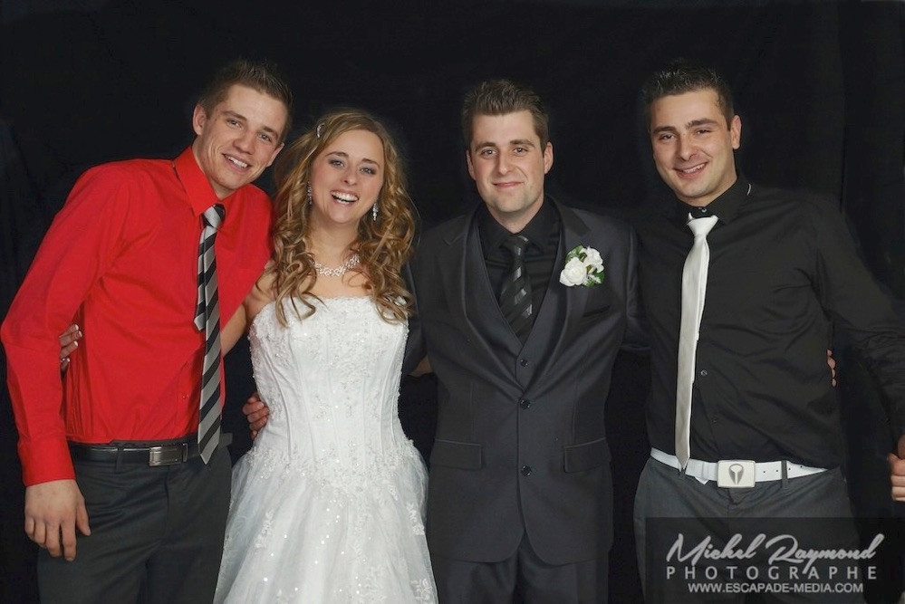 Photos studio de mariage lors des félicitations aux mariés de Kim et Amélie. Qui à eu lieu à Pohénégamook le 31 décembre au soir 2013. Pour leur mariage ils ont choisi également la station Photobooth. Pour les photographies félicitations aux mariés ce fait à l’entrée dans la salle de réception, le maître de la cérémonie appelle en premier lieux les parents, femmes et hommes d’honneur ainsi de suite. Pour quelques raisons si nous avons pas le temps de photographier tous les invités le reste ce fera dans la soirée. Ce fut un succès sur toutes la ligne. Des photographies de chacun des invités clairs et nets.